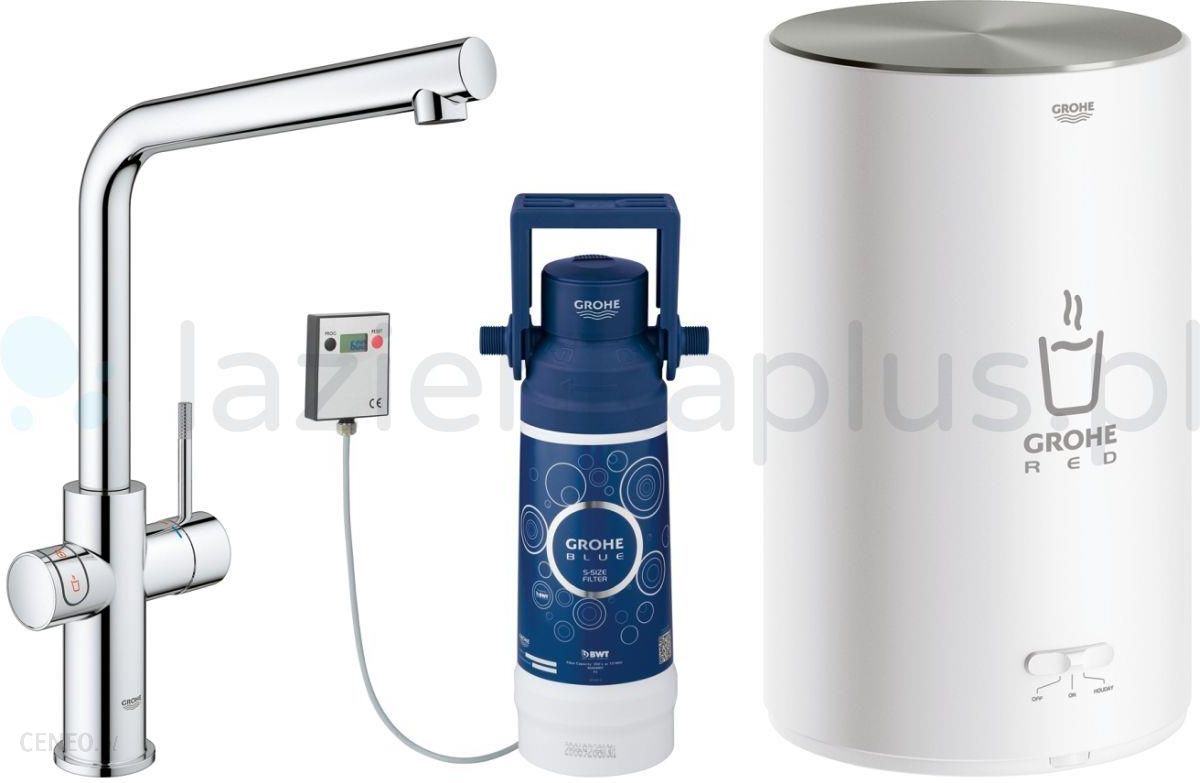 Red New Duo Grohe bateria kuchenna z boilerem 4 litry chrom – 30327 001 elementy składowe: Grohe Red Duo bateria kuchenna montaż jednootworowy wylewka L GROHE ChildLock przycisk uruchamiający wrzącą wodę Certyfikowane przez TÜV, potrójne, elektroniczne zabezpieczenie przed przypadkowym uruchomieniem GROHE StarLight powłoka chromowa GROHE SilkMove głowica ceramiczna 28 mm rura izolacyjna zasięg obrotu 150° wypływ dwukanałowy giętkie węże przyłączeniowe przyłącze do podgrzewacza GROHE Red GROHE Red boiler M size podgrzewacz pojemnościowy do wody gorącej 3 litry wrzącej wody 100° C całkowita pojemność 4 litry wymagane ciśnienie: 1-7 bar z elastycznym przewodem przyłączeniowym i odpływem do wrzącej wody znak CE napięcie zasilania 230 V 50 Hz pobór mocy 2100W pobór mocy w spoczynku 15W klasa energetyczna A zestaw filtrów GROHE Red dla ochrony kotła przed osadzaniem się kamienia pojemność 600 L w 15° dKH 5-fazowy filtr jednostka pomiaru natężenia przepływu