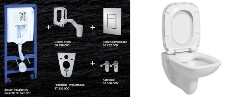 Zestaw:Grohe Rapid stelaż WC 5w1 Skate Cosmopolitan 38827000Roca Debba miska WC wisząca, podwieszana Rimless A34699L000Roca Debba deska sedesowa WC duroplast wolnoopadająca A8019D2004 Specyfikacja techniczna: 1. Stelaż podtynkowy:Zestaw podtynkowy Grohe Rapid SL 5w1 model 38827000. Zestaw Promocyjny z Grohe Fresh – unikatowy system odświeżania toalety. Stelaż podtynkowy: rama stalowazbiornik 6-9Lprzycisk uruchamiający model Skate Cosmopolitankolor przycisku – chrom połyskGrohe Fresh – świeży zapach w łaziencewspornikipodkładka wyciszającawysokość 120 cm, Nr katalogowy 38 827 000 Zestaw GROHE Rapid SL 5w1 38827000 stelaż podtynkowy do miski podwieszanejW skład zestawu wchodzą wszystkie niezbędne elementy, zatem kupujesz, gotowy do instalacji , kompletny zestaw. Rama stelażu wykonana jest ze stali i ma nośność do 400 kg, gwarantując stabilność i wytrzymałość przez długie lata. Stelaż jest montowany do ściany przy pomocy 2 kątowników, umożliwiających bezstopniową regulację głębokości.W zestawie znajduje się specjalna mata wygłuszająca, która zniweluje odgłosy dociskania miski do ściany, dodatkowo zabezpieczając ceramikę i płytki przed uszkodzeniami.W komplecie znajduje się również przycisk Skate Cosmopolitan w kolorze chrom połysk z unikalną powłoką GROHE StarLight jak również zestaw adaptacyjny Fresh, dający możliwość szybkiego ulokowania kostki higienicznej w spłuczce 2. Roca Debba miska WC wisząca, podwieszana Rimless A34699L000Montaż: podwieszana:Długość: 355 mm.Szerokość: 540 mm.Wysokość: 400 mm.Kształt: prostokątny 3. Roca Debba deska sedesowa WC duroplast wolnoopadająca A8019D2004Przeznaczenie: Miska wcMateriał: DuroplastW komplecie: zestaw montażowySystem deski: SoftCloseGwarancja: 2 lata Deska wyposażona została w system wolnoopadający oraz system łatwego wypinania, który w znaczący sposób poporawia komfort użytkowania oraz utrzymanie higieny