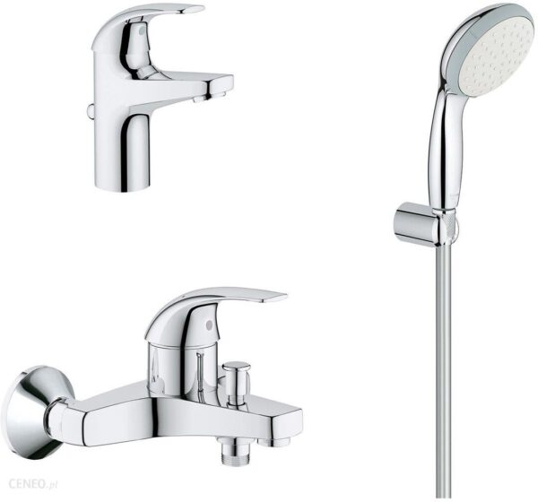 Zestaw wannowy Start Curve składa się z trzech produktów: bateria umywalkowa, bateria wannowa, Zestaw punktowy Vitalio Go. Zestaw wannowy Start Curve posiada system punktowy stworzonyz myślą o niezawodnym działaniu. Prysznic ręczny Vitalio Go oferuje delikatny, miękki strumień Rain. Jego dysze zabezpieczono przed zatkaniem przez osady wapienne – system SpeedClean Pozwala pozbyć się ich, po prostu przecierając po kąpieli słuchawkę ręką. Prysznic i uchwyt dla większej trwałości pokryto warstwą chromu StarLight – chroni on przed uszkodzeniami i zmatowieniem. Dużą wytrzymałością odznacza się również wąż SilverFlex, który zabezpieczono przed załamywaniem i skręcaniem. Baterię umywalkową GROHE Start Curve stworzono z myślą o sprawnej, niezawodnej obsłudze i ochronie środowiska. Wyposażono ją w ceramiczną głowicę GROHE SilkMove, która zapewnia precyzyjne i przyjemnie proste użycie przez lata eksploatacji. Dzięki niej, zmniejszysz wydatki na wodę – dzięki ogranicznikowi przepływu GROHE EcoJoy, jej pobór zredukowano do zaledwie 5,7 l/min. W zestawie znajduje się rekomendowana bateria wannowa Grohe przeznaczoną do montażu ściennego. Ceramiczna głowica ma rozmiar 46 mm, posiada automatyczny przełącznik: wanna/prysznic, zintegrowany zawór zwrotny oraz zabezpieczenie przed przepływem zwrotnym.