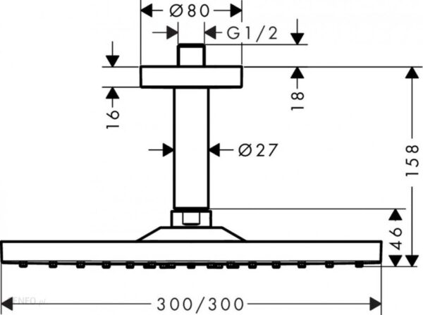 Hansgrohe Raindance E Głowica prysznicowa 300 air 1jet z przyłączem sufitowym EcoSmart Chrom 26251000Kolor: ChromWymiaryszerokość: 300 mmodległość od sufitu: 158 mm• ecoSmart 9 l/min• strumień: rainAir• przepływ rainAir (przy 3 bar): 19 l/ min• chromowana tarcza strumieniowa• materiał: metal• możliwość demontażu do czyszczenia• montaż: sufit• przyłącze DN15