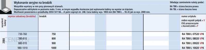 KERMI RAYA – satysfakcja w doskonaej formie. Wygodne wejcie do wyjtkowo komfortowej kabiny. Model Raya prezentuje si zgrabnie i niezwykle atrakcyjnie. Przejrzysta i wykorzystujca proste linie konstrukcja, oparta na gadkich profilach. Wyposaona w praktyczne drzwi wahadowe oraz perfekcyjny mechanizm windowy stanowi idealny model do montau. Ekskluzywne wzornictwo za niewygrowan cen.RA TBR/L- cianka boczna ruchomaDo montau z RA 1KR/L drzwi wahadowe 1-skrzydowe / RA 1NR/L drzwi wahadowe 1-skrzydowe z polem staym.Czciowo obramowana ciana boczna jednoskrzydowa z uchwytem RAYA (wewntrz), zamontowana bez progu otwierana do rodka i na zewntrz; zamontowana z progiem otwierana jest jedynie do rodka.ciana boczna odchyla si do rodka, co znaczenie uatwia czyszczenie i wentylacj kabinyProfile wykonane s z eloksalowanego aluminium, uchwyty i zawiasy z najwyszej jakoci metalu.10 mm zakresu regulacji na profilu przyciennym i 20 mm na zawiasie6 mm szko hartowane z powok uatwiajc czyszczenie KermiCleanNajwyszej jakoci eloksalowane profile aluminiowe w kolorze srebro wysoki poysk.Listwa magnetyczna i profile uszczelniajce na caej wysokoci drzwi oraz pozioma uszczelkaWysoko seryjna 2000 mmMoliwo wykonania kabiny w kolorach.Kolory doskonale potrafi podkreli atmosfer. azienki. Dziki kolorom sanitarnym z palety Kermi mona dopasowa kolorystycznie kabin do wystroju azienki lub nawet grzejnika dekoracyjnego Kermi. Edycja Natura to wiee wyraziste kolory. Paleta Ethno to ciepe i soczyste kolory ziemi. Edycja Soft prezentuje kolory szlachetne i matowe. Stylizowane barwy z edycji Metalic s pene klasycznego blasku. Poza tym istniej moliwo wybranie kolory z klasycznej palety RAL.Model dostpny take w wykonaniu na wymiar oraz wyboru koloru szka lub profili . Cena i dostpno na zapytanie.