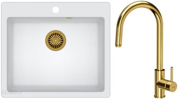 Zestaw zawiera zlewozmywak MORGAN 110 GraniteQ biały + bateria kuchenna JENNIFER z wyciąganą wylewką + syfon z odpływem 3,5″ SteelQ PVD złoty Opis: Nowoczesne wzornictwo – dostosowane do aktualnych trendów. Zlewozmywak wykonany z GraniteQ gwarantuje najwyższą higieniczność i trwałość. Rozetka przelewu również wykonana jest ze stali szlachetnej SteelQ w technologii PVD w kolorze dopasowanym do koloru pozostałych elementów co jeszcze bardziej podkreśla jego urodę. Zlewozmywak wyposażony jest w odpływ ze stali szlachetnej SteelQ w technologii PVD w kolorze dopasowanym do pozostałych elementów co nadaje produktowi elegancki wygląd. Głębokie i pojemne komory zlewozmywaków Quadron to ich cecha wyróżniająca, która zapewnia duży komfort użytkowania. Syfon z możliwością podłączenia zmywarki lub pralki. Łatwy montaż – w komplecie zaczepy mocujące. ZŁOTA bateria idealnie pasuje do najnowszych trendów! Elementy baterii wykonane ze stali szlachetnej SteelQ – materiału pozbawionego ołowiu co w połączeniu z technologią PVD gwarantuje najwyższą higieniczność. Perlator napowietrzający ECO – zapewnia oszczędność wody nawet do 30%. Dźwignia jednouchwytowa– w łatwy i szybki sposób dostosujesz temperaturę i natężenie strumienia wody do swoich potrzeb. Głowica ceramiczna – zmniejsza możliwość powstawania kamiennych osadów i zanieczyszczeń. Mocowanie QFix – zapewnia łatwy i szybki montaż (również na blacie) oraz wysoką stabilność baterii. Wyciągana wylewka – idealna do mycia dużych naczyń. Wyciągany wąż wylewki umożliwia wygodne napełnienie wodą naczynia znajdującego się w i poza zlewozmywakiem jak również umycie blatu. ZLEWOZMYWAK MORGAN 110: Minimalna podbudowa: od 55 cm Materiał: GraniteQ Kolor zlewozmywaka: Biały metalik Kolor odpływu: Złoty Sposób montażu: Wpuszczany w blat Wymiar zlewozmywaka: 570 mm x 500 mm Wymiar komory: 506 mm x 388 mm x 220 mm Wymiary wycięcia w blacie: 545 mm x 475 mm Odpływ: zatyczkowy 3.5” Syfon: z możliwością podłączenia zmywarki lub pralki Wycięte otwory montażowe 35mm: TAK GWARANCJA: 25 LAT BATERIA KUCHENNA JENNIFER : Typ: stojąca, jednouchwytowa Materiał: stal szlachetna SteelQ Wykończenie/Kolor: Złoty Głowica: ceramiczna Wysokość całkowita: 406 mm Wysokość strumienia wody: 221 mm Wylewka: obrotowa 360° Zasięg wylewki: 207 mm Wyciągana wylewka – idealna do mycia dużych naczyń W komplecie: aż 40cm wężyki podłączeniowe wody 3/8″, mocowanie QFix, uszczelki, instrukcja montażu Dodatkowe informacje: wylewka obrotowa 360°, perlator napowietrzający ECO – zapewnia mniejsze zużycie wody GWARANCJA: 5 LAT