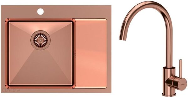 Zestaw zawiera zlewozmywak stalowy RUSSEL 116 MIEDZIANY + bateria kuchenna INGRID + syfon z odpływem 3,5″ Opis: Nowoczesne wzornictwo – dostosowane do aktualnych trendów. Zlewozmywak wykonany ze stali szlachetnej SteelQ PVD o grubości 0,8mm co gwarantuje najwyższą higieniczność i trwałość. Głębokie i pojemne komory zlewozmywaków Quadron to ich cecha wyróżniająca, która zapewnia duży komfort użytkowania. Zlewozmywak wyposażony jest w odpływ ze stali szlachetnej SteelQ w kolorze dopasowanym do koloru zlewozmywaka co nadaje produktowi elegancki wygląd. Przetłoczenia na dnie komory wspomagają utrzymanie zlewu w czystości i szybki spływ wody a jednocześnie nadają zlewozmywakowi bardzo elegancki i nowoczesny wygląd. Ociekacz z obniżoną strefą użytkowania to komfortowe rozwiązanie zapewniające ochronę blatu przed wodą, a ergonomiczne jego ukształtowanie pozwala nie tylko łatwo ustawiać naczynia do suszenia ale także utrzymać zlew w nieskazitelnej czystości. Syfon z możliwością podłączenia zmywarki lub pralki. Łatwy montaż – w komplecie zaczepy mocujące. Mata wygłuszająca w komplecie! Nowoczesne wzornictwo – dostosowane do aktualnych trendów. Elementy baterii wykonane ze stali szlachetnej SteelQ – materiału pozbawionego ołowiu co w połączeniu z technologią PVD gwarantuje najwyższą higieniczność. Wylewka obrotowa 360° – umożliwia swobodne używanie. Perlator napowietrzający ECO – zapewnia oszczędność wody nawet do 30%. Dźwignia jednouchwytowa– w łatwy i szybki sposób dostosujesz temperaturę i natężenie strumienia wody do swoich potrzeb. Głowica ceramiczna – zmniejsza możliwość powstawania kamiennych osadów i zanieczyszczeń. Mocowanie QFix – zapewnia łatwy i szybki montaż (również na blacie) oraz wysoką stabilność baterii. ZLEWOZMYWAK RUSSEL 116: Minimalna podbudowa: od 45 cm Materiał: Stal szlachetna SteelQ w technologii PVD Kolor: Miedziany Sposób montażu: Wpuszczany w blat Wymiar zlewozmywaka: 600 mm x 480 mm Wymiar komory: 380 mm x 380 mm x 190 mm Wymiary wycięcia w blacie: 580 mm x 460 mm Odpływ: zatyczkowy 3.5”, w kolorze zlewozmywaka Syfon: z możliwością podłączenia zmywarki lub pralki Wycięte otwory montażowe 35mm: TAK GWARANCJA: 25 LAT BATERIA KUCHENNA INGRID: Typ: stojąca, jednouchwytowa Materiał: stal szlachetna SteelQ Wykończenie/Kolor: Miedziany Głowica: ceramiczna Wysokość całkowita: 354 mm Wysokość strumienia wody: 234 mm Wylewka: obrotowa 360° Zasięg wylewki: 211 mm W komplecie: aż 40cm wężyki podłączeniowe wody 3/8″, mocowanie QFix, uszczelki, instrukcja montażu Dodatkowe informacje: wylewka obrotowa 360°, perlator napowietrzający ECO – zapewnia mniejsze zużycie wody GWARANCJA: 5 LAT